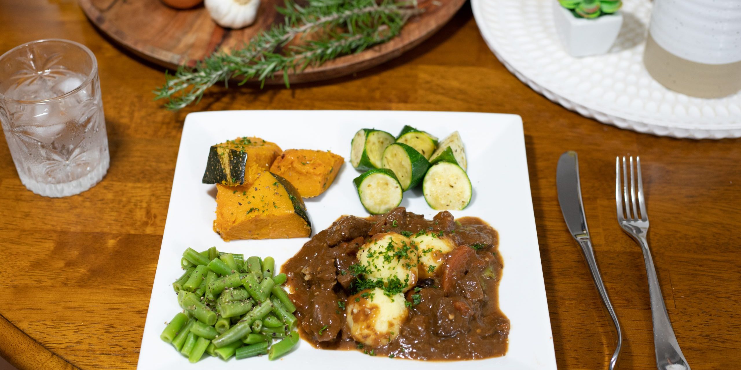 Slow cooked chunky French-style beef and red wine casserole served with creamy mash and market fresh vegetables Project navigationPreviousPrevious project:Fruit Salad and CustardNextNext project:Orange Almond Cake